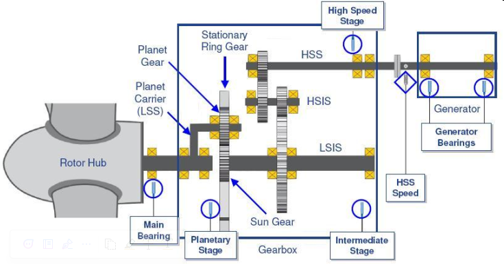 Echoenergia 1.X wind turbines are equipped with the Bently Nevada 3701 condition monitoring system. It has 6 accelerometers positioned as shown in the image below.